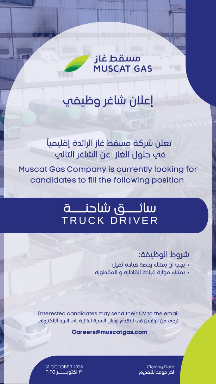 مطلوب سائق في سلطنة عمان لدي شركة مسقط غاز وذلك لجميع الجنسيات ولمؤهلات مختلفة شرط مهارة قيادة مقطورة ورخصة نقل ثقيل عبر موقعنا موقع شاغر دوت كوم