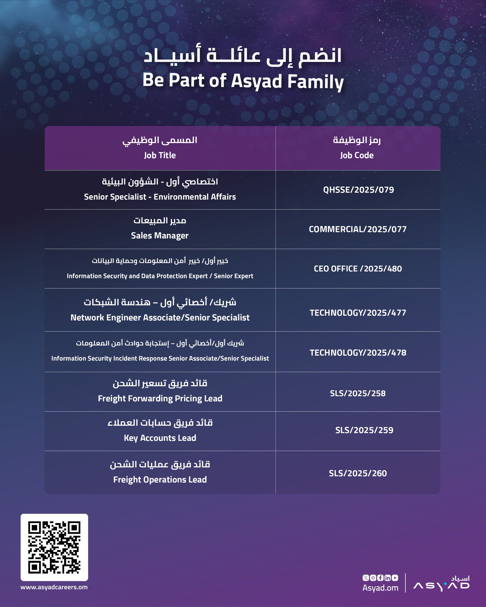 وظائف شركة أسياد عمان (إدارية – هندسية – فنية – لوجستية) أكثر من 50 شاغر وظيفي لجميع الجنسيات ولجميع المؤهلات للرجال والنساء في السلطنة برواتب ومزايا عالية