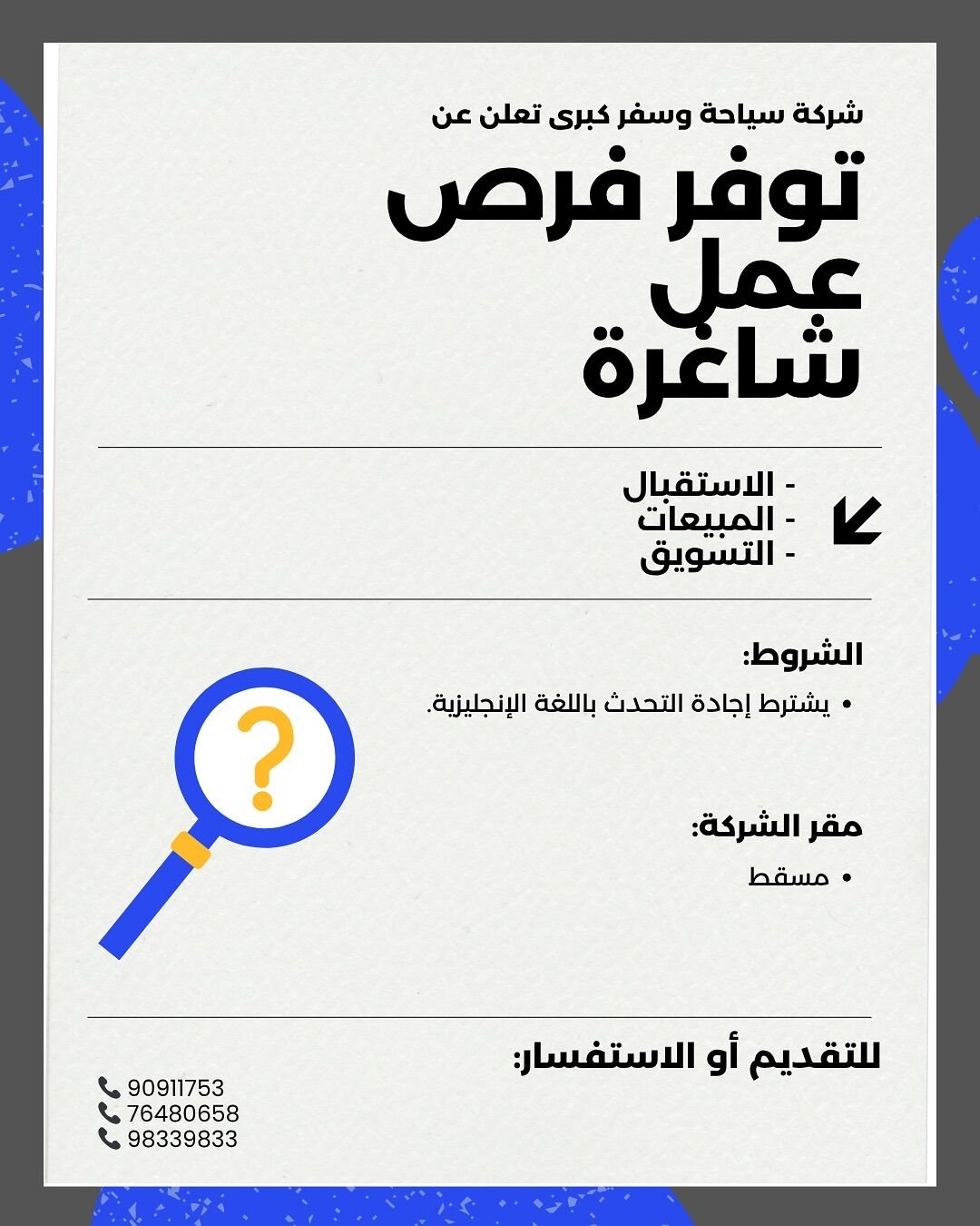 وظائف في سلطنة عمان لدي شركة سياحة وسفر للرجال والنساء وذلك في مجالات المبيعات والاستقبال والتسويق لجميع الجنسيات وها قد نعرضها لكم عبر موقعنا موقع شاغر دوت كوم